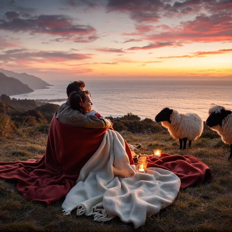 Enjoy golden hour overlooking the sea, with a blanket, a drink, and our gentle sheep by your side.